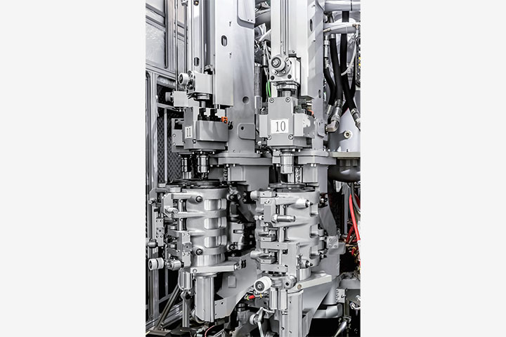 標準模腔(制瓶容積 0.25-2.5L)旋轉(zhuǎn)式吹瓶機,應用于各類飲料等 PET 瓶的生產(chǎn),產(chǎn)能可達 58500 瓶/小時。