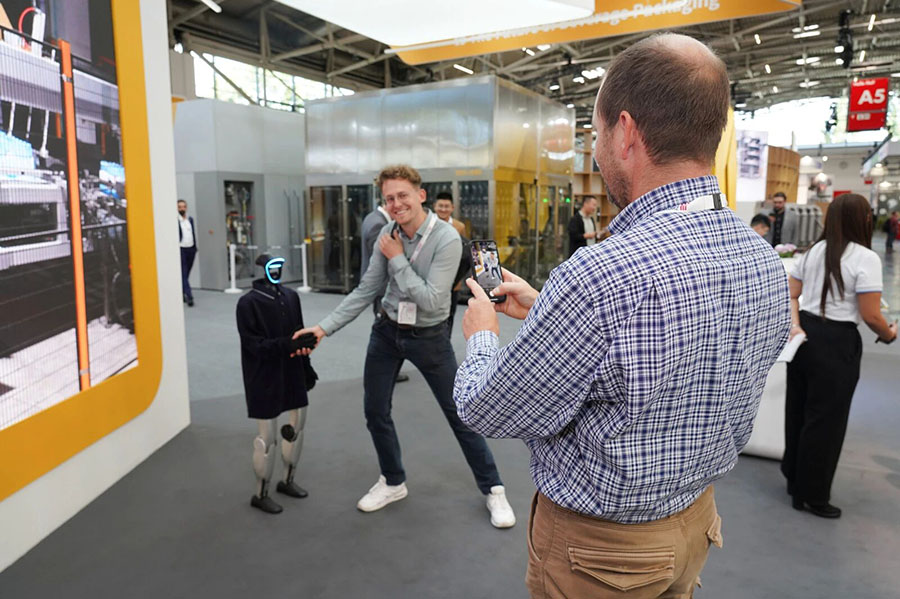 展臺前,人形機器人正在為觀眾們講解達意隆的公司介紹與設(shè)備優(yōu)勢,觀眾們紛紛駐足互動,在一問一答間,對達意隆的技術(shù)實力與產(chǎn)品創(chuàng)新有了更生動的認知。